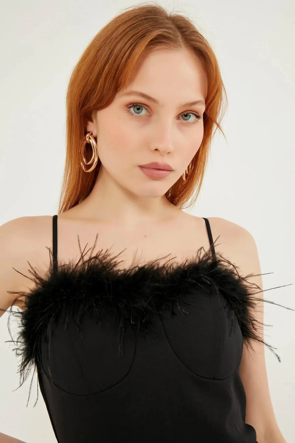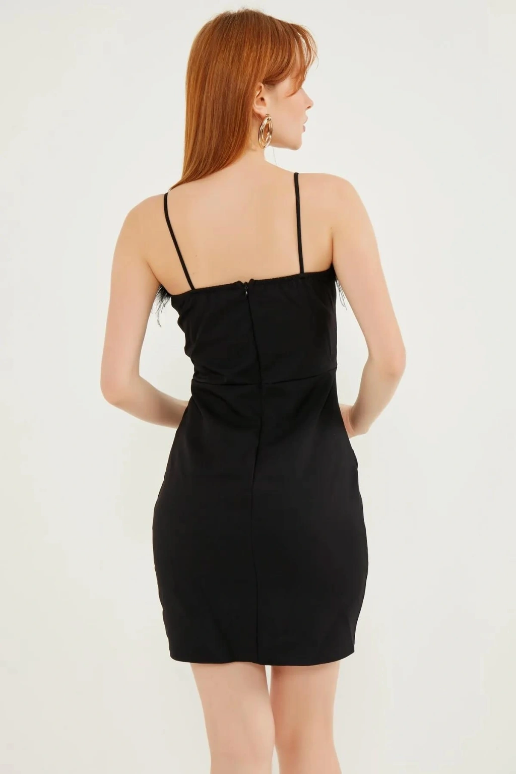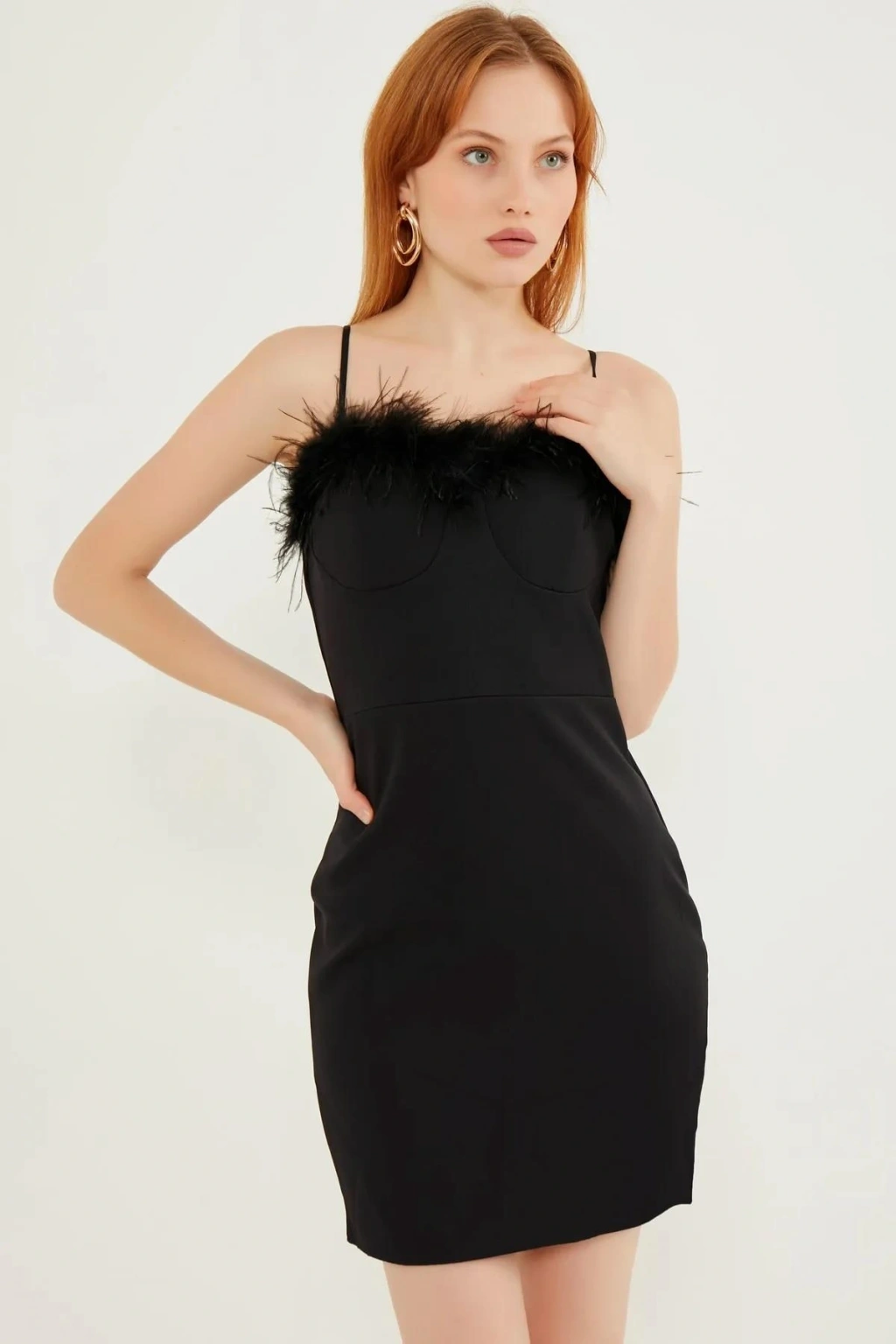 Siyah Yaka Tüy Detaylı Siyah Elbise